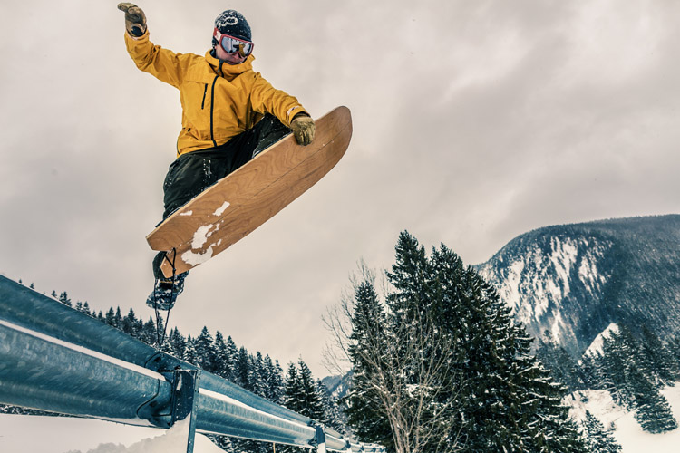 Keine Bindung, keine Kanten, kein Belag – aber eine Riesengaudi. Bin mal gespannt, was besser funktioniert: Bluntnose und Sidedut oder klassische Powdernose mit Reversesidecut.