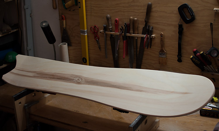 Pünktlich kurz nach Frühlingsanfang komm ich langsam aus dem Knick mit meinem Powdersurfer. Leider viel zu spät, aber die nächste Saison ist ja quasi schon in Sichtweite. Um auch ohne Bindung Druck auf die Kanten zu bekommen, habe ich das Tail extrem schmal gebaut, so dass Fersen und Zehen etwas überstehen. Bin ich mal sehr gespannt, ob das funktioniert.