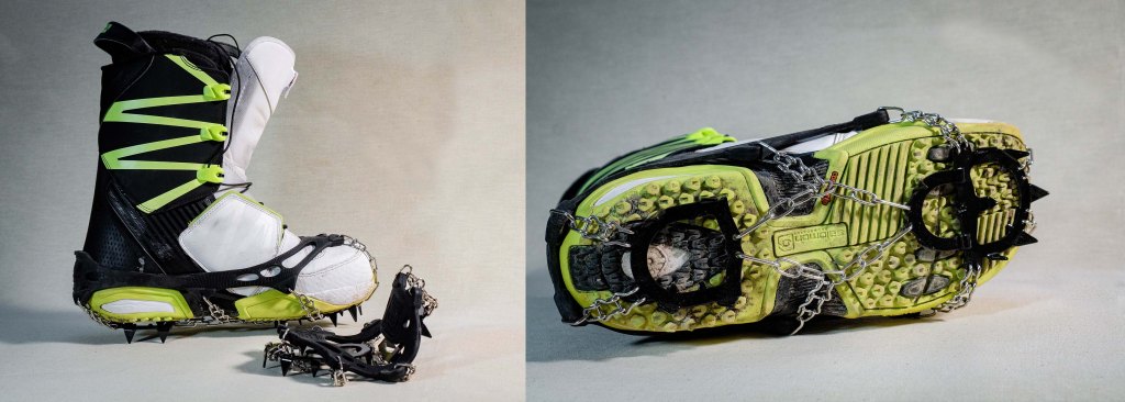 Bei Hochtouren oder im Frühling, wenn am Morgen noch alles gefroren ist, sind Steigeisen keine schlechte Investition. Wichtig dabei: snowboardboot-kompatibel müssen sie sein.