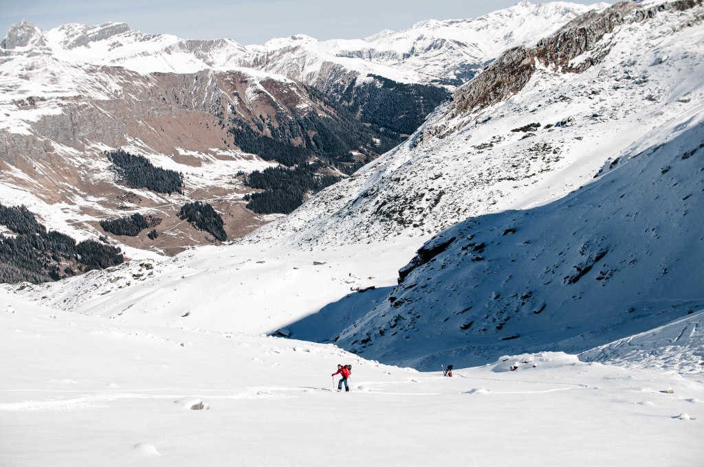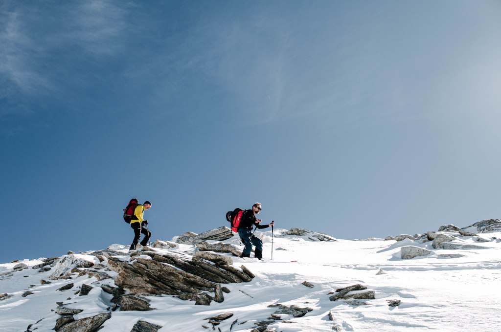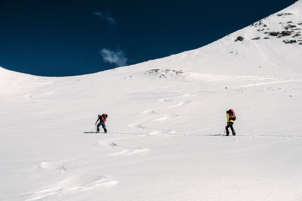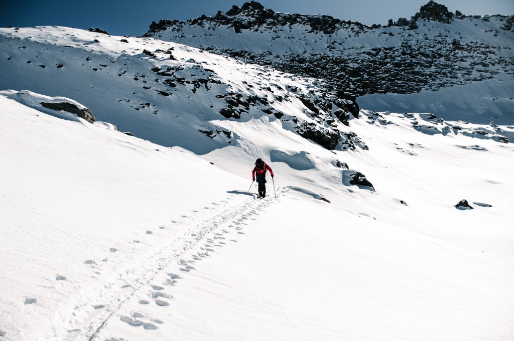 Der Einstieg ins Gelände ist erst mal super, denn wir treffen auf ca. 15 cm frischen Powder. Der allerdings liegt ohne weitere Unterlage direkt auf den Felsen. Super. Als sich dann beim ersten Umbauen auch noch ein Ski verabschiedet, gewinnen wir dadurch ein paar weitere Aufstiegsmeter. Traumstart.