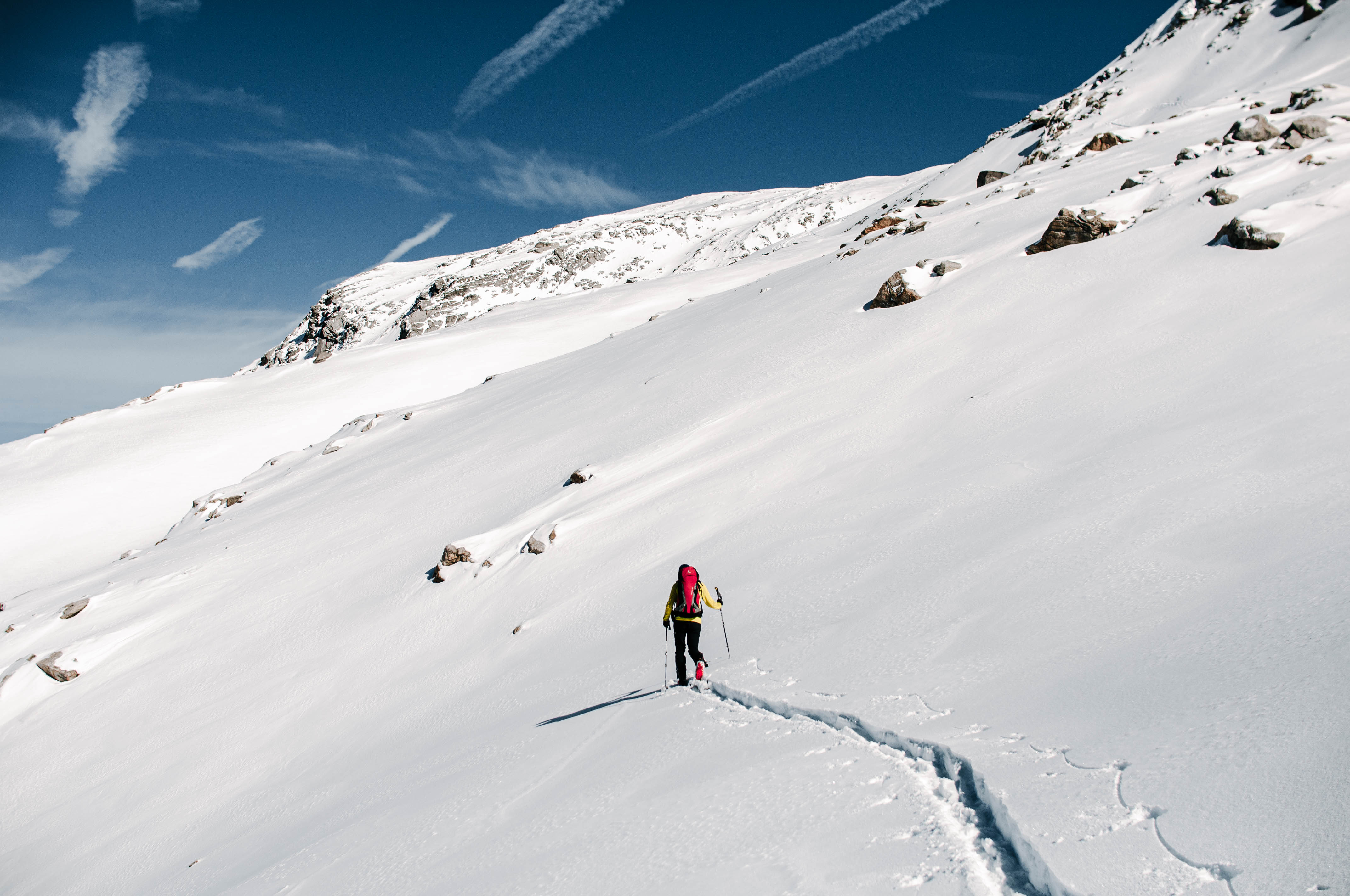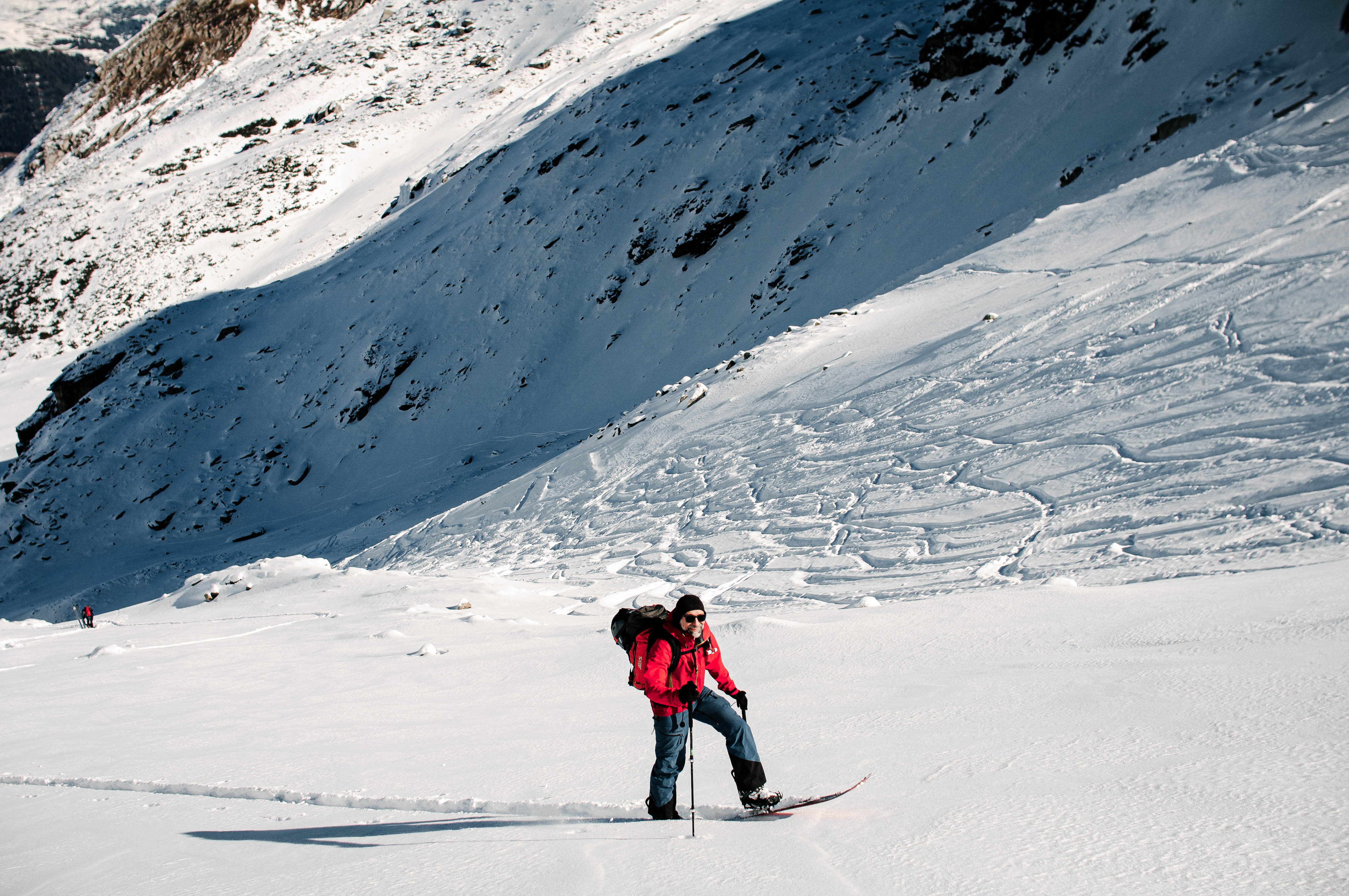 Der Einstieg ins Gelände ist erst mal super, denn wir treffen auf ca. 15 cm frischen Powder. Der allerdings liegt ohne weitere Unterlage direkt auf den Felsen. Super. Als sich dann beim ersten Umbauen auch noch ein Ski verabschiedet, gewinnen wir dadurch ein paar weitere Aufstiegsmeter. Traumstart.